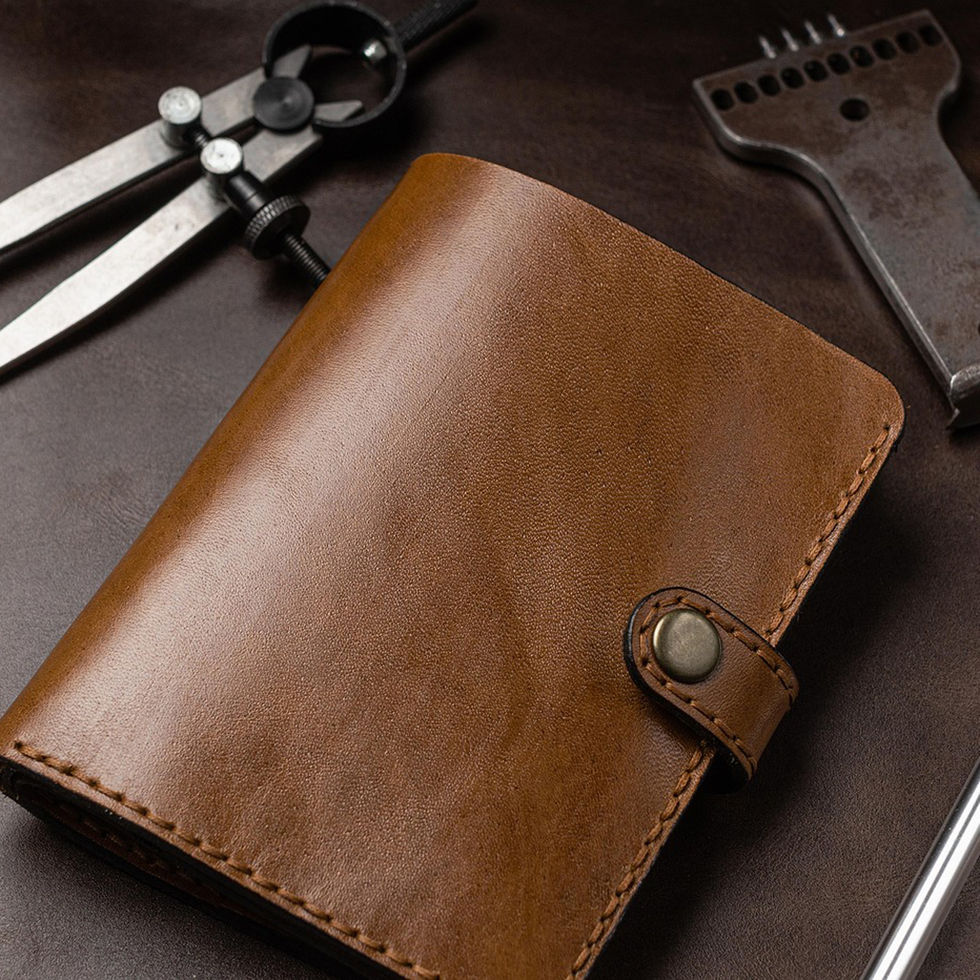 This project showcases the art of sewing and leather crafting, featuring images of hands sewing fabric, industrial sewing machines, and a brown leather wallet with metal button clasp.